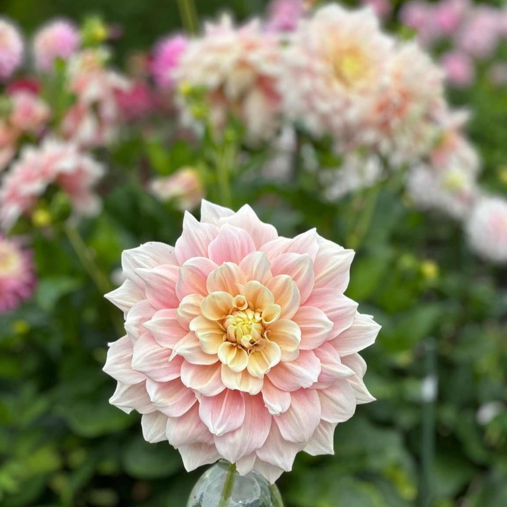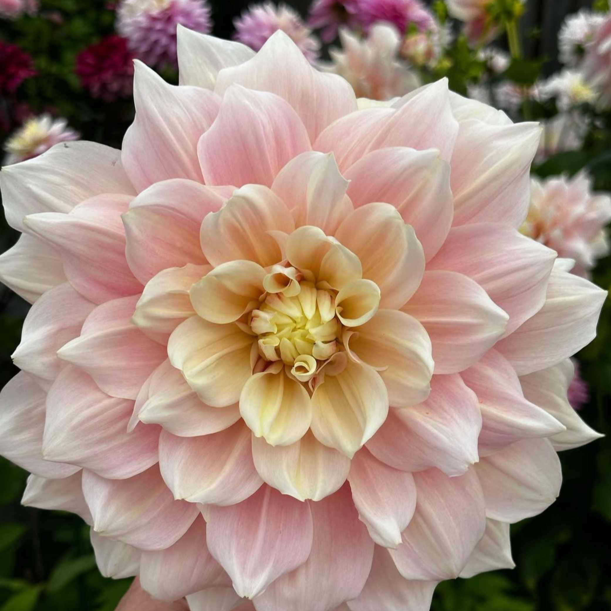 A ‘Break Out’ dália hatalmas, krémszínű–halvány rózsaszín virágfejeiről ismert, amelyek gyakran elérik a 20–25 cm-es átmérőt is. Finoman fodrozott, puha pasztell szirmai romantikus, légies hatást keltenek, miközben a virágok mérete valódi látványelem minden kertben. Középmagas, erőteljes növekedésű fajta (kb. 100–120 cm), hosszú szárakkal, így különösen alkalmas csokrokhoz és dekoratív vágott virágnak. Nyár közepétől egészen az első fagyokig kitartóan virágzik, és bármely pasztell vagy vintage árnyalatú ültetés gyönyörű fókuszpontja lehet.