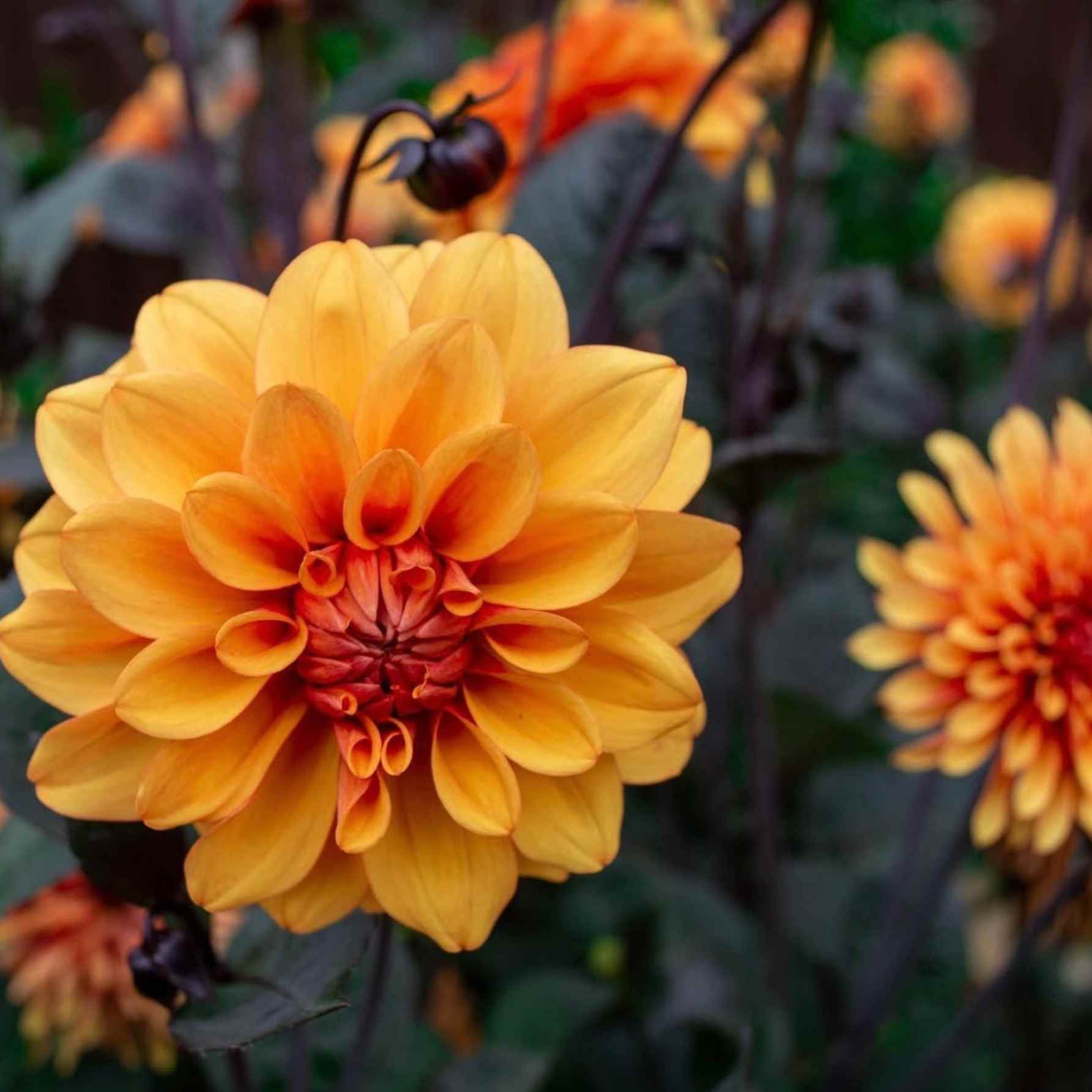 A ‘David Howard’ dália vibráló narancssárga virágaival és sötét, bronzos lombjával azonnal életre kelti a kertet. A színek közötti erős kontraszt modern, karakteres összhatást ad, amely messziről is feltűnő. Középmagas, rendezett növekedésű fajta, amely egész nyáron át megbízhatóan virágzik. Látványos a kertben, de vágott virágként is lenyűgöző.